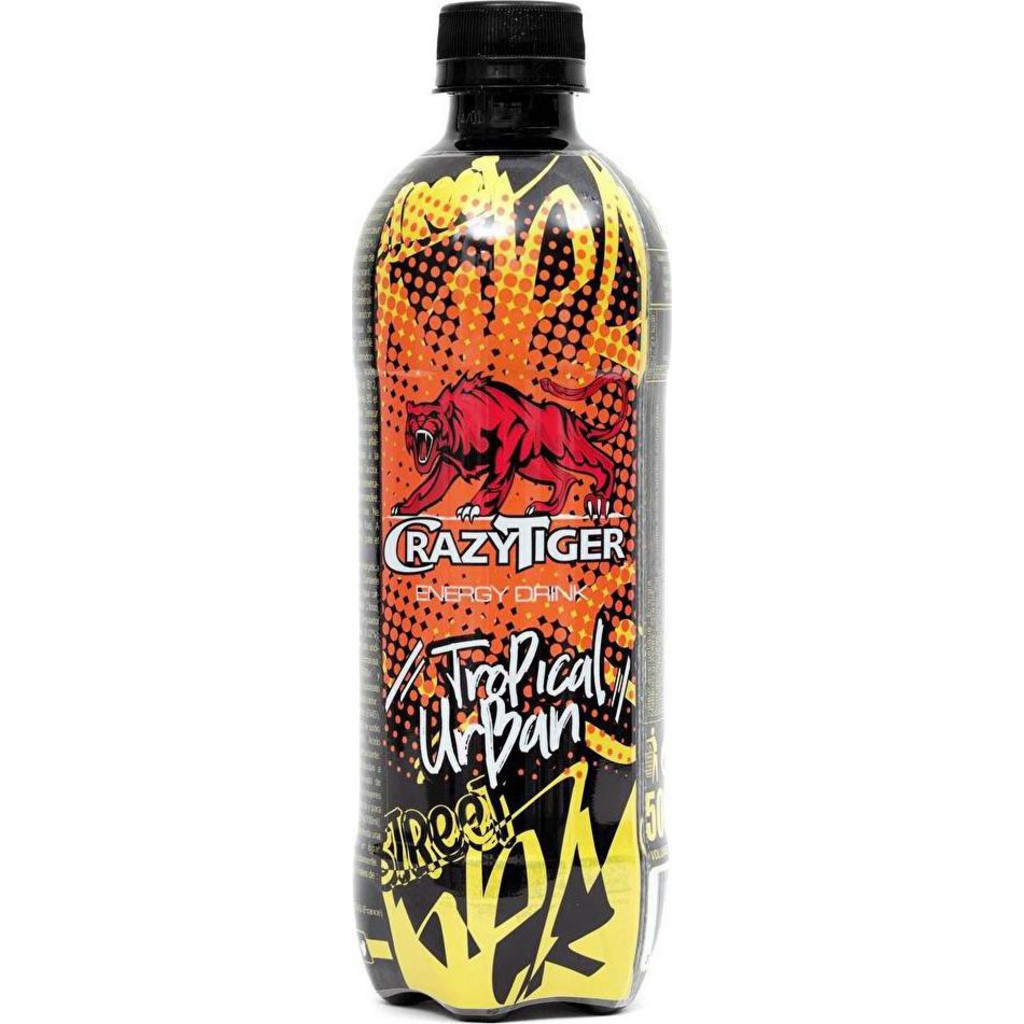 Boissons énergisantes de la marque Crazy Tiger. Boisson énergétique tropical urban 50 cl. EAN 3760205599118.